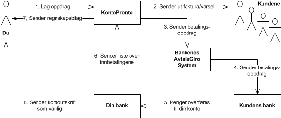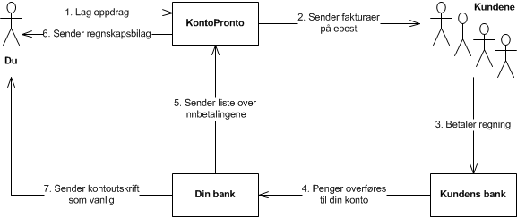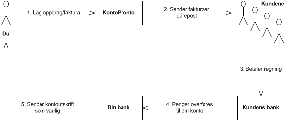 Uten bankavtaler er KontoPronto et enkelt fakturasystem. Du lager fakturaer med profesjonelt utseende, og kundene betaler dem i banken sin som vanlig.